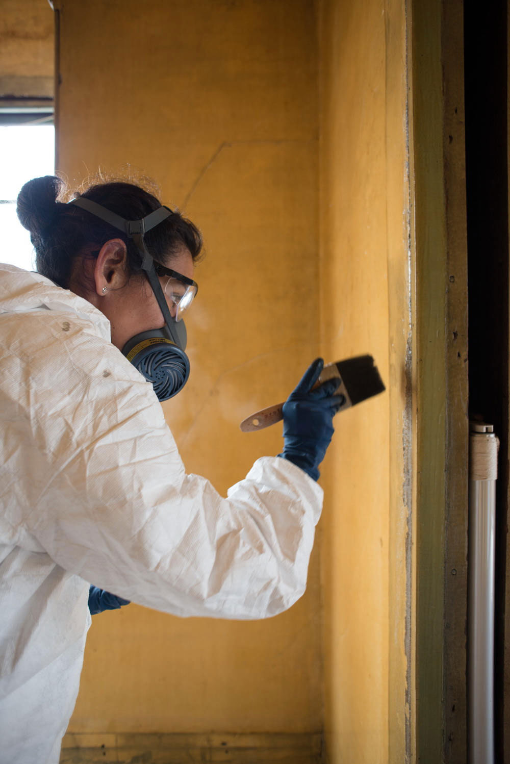 My coworker Johana Moreno and I conserved and restored the walls to the period of significance: the time when Ireland lived there. We worked room by room, in coordination with contractors doing other work on the site, such as the seismic retrofitting, the installation of a new electrical system, and the building additions. We sectioned off each room with plastic to prevent the transmission of dust and to keep other workers on site from disrupting and accidently touching conservation work. For us, there would be nothing worse than watching a worker covered in plaster dust break through the plastic barriers! Luckily, that didn’t happen.