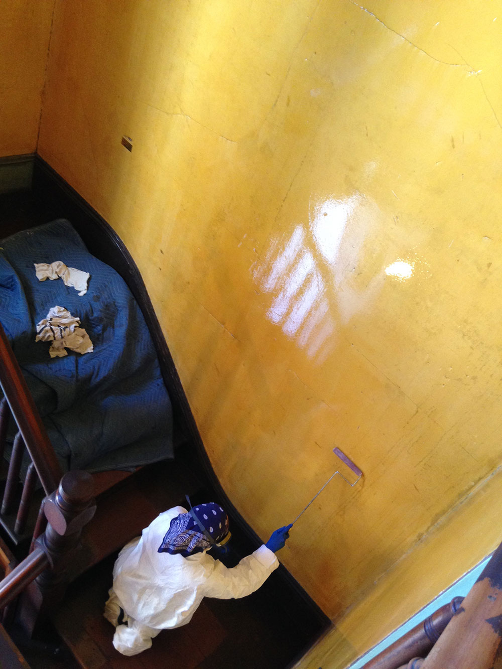 As an architectural conservator, I was intrigued to see his artistic, contemporary outlook on the historical fabric of the house, which dated back to the 1880s. He had torn away the historic wallpaper and covered the walls in a commercial varnish in order to highlight and expose the building’s history—the cracks, the staining, the scratches, the bumps, the holes, and the effects of building settlement. We had to make sure that some of the holes and cracks we filled in were not holes that Ireland had originally wanted to highlight and expose. Also, it is always challenging and interesting to conserve contemporary materials, as it is somewhat new in the field of conservation. As plastic, commercial paints, aluminum, and other materials have begun to deteriorate, their need for conservation has increased.
